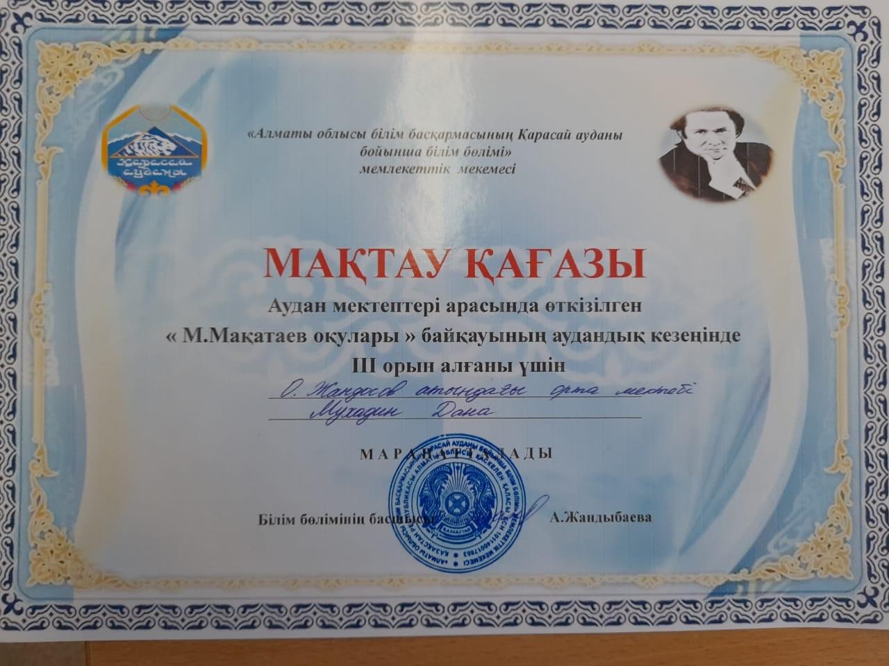 М.Мақатаев оқулары » Алматы облысы Қарасай ауданы О.Жандосов атындағы орта мектеп
