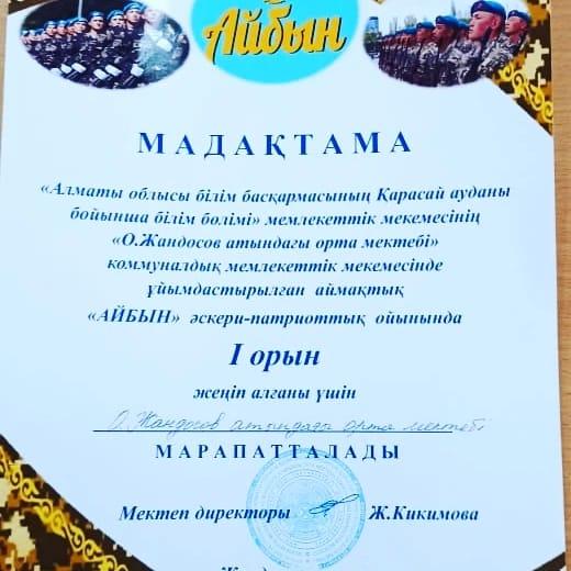 14 март 2022 0 1 2 3 4 5 "Айбын" байқауының аймақтық кезеңі "Айбын" байқауының аймақтық кезеңінде оқушыларымыз І орын иегері атанды.Жетекшісі АӘжТД пәні мұғалімі Қанатжан Алдияр.
