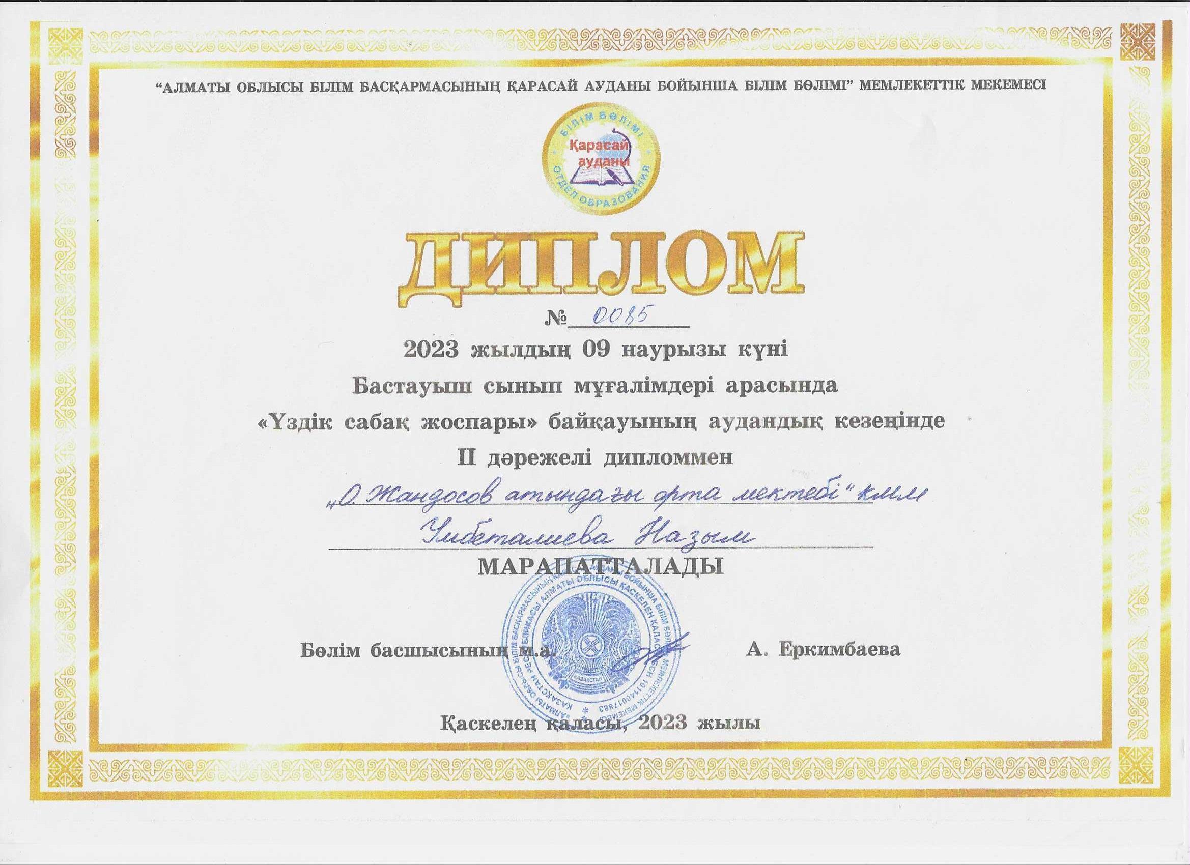 27 март 2023 0 1 2 3 4 5 Аудандық "Үздік сабақ жоспары" атты байқау Аудандық "Үздік сабақ жоспары" атты бастауыш сынып мұғалімдеріне арналған байқаудың ІІ орын иегері Умбеталиева Назым