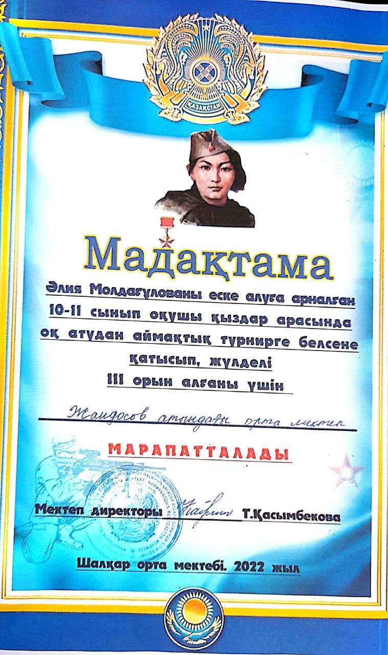 Әлия Молдағұлованы еске алуға арналған 10-11 сынып қыздары арасындағы оқ атудан аймақтық жарысында 3 орын иегері атанды